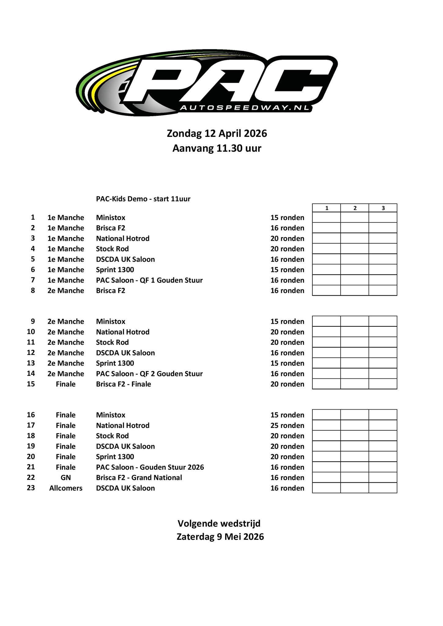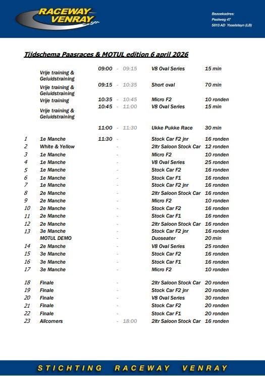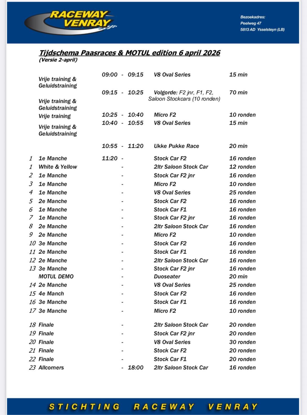 Verder deelt Trackstar mede dat er geen ruimte voor extra auto's in de pits aanwezig is. Deze zullen dus ergens anders moeten worden gestald. Op het programma staan de eerste World Qualifying round voor de F2 stockcars, Saloon stockcars Charlene Kingston Memorial en de 1400 stockcars.