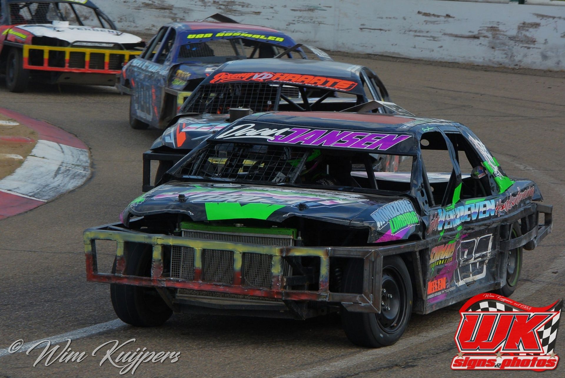 A week later the Saloon Stockcars found themselves on the island of Texel for their speedweekend. 26 cars raced on both days. The two heats on the Saturday went to Wouters with #541 Otto de Wilde and #268 Bas Spaansen the placemen in heat one. Van Rosmalen and Terpstra took second and third in heat two. Heat 1 on the Sunday was won by Wouters from van de Kraats and van Rosmalen. Heat 2 went to #321 Hein- Durk Vellema from O. de Wilde and #511 Arjan de Wilde. An almighty downpour turned the already wet track into a mudbath and it was decided not to run the final.