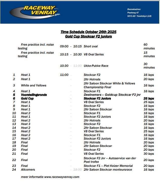 Nederlandse deelname is er van #400 Mikey van Rosmalen, die tijdens het World Final weekend al goed mee kon komen. Mikey rijdt in zowel King's Lynn en Mildenhall. #139 Jarno van der Wal, normaliter rijdend in de F2 stockcars rijdt op vrijdag in King’s Lynn en #744 Mats Bruin op zondag in Mildenhall. We wensen Mikey, jarno en Mats veel plezier in Engeland.